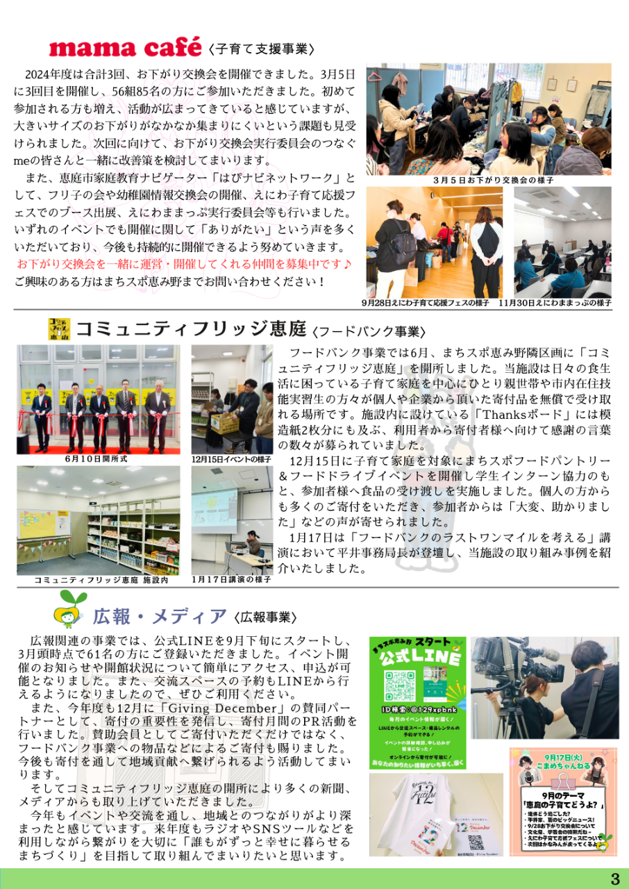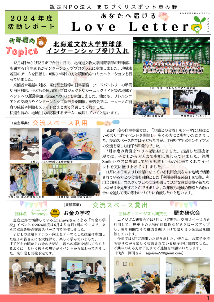 2024年度も様々な活動を行いましたが、中でも「コミニュティフリッジ開所」や」「総合計画に係る業務委託」、「北海道文教大学野球部インターシップ受け入れ」の3点が特に大きいトピックスだったと振り返っています。