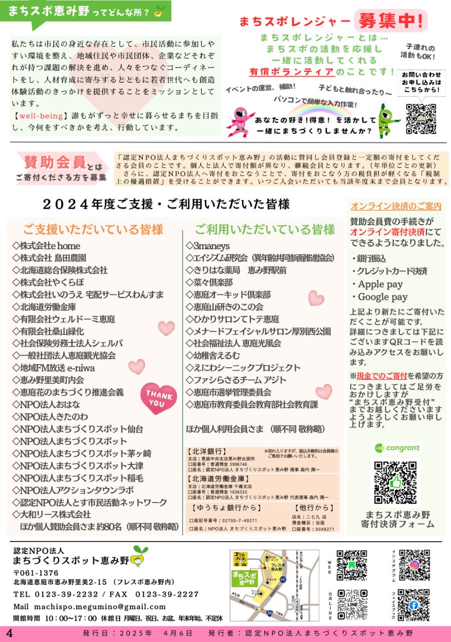 2024年度におきましても、賛助会員の皆様から多くのご寄付をいただき、心より感謝申し上げます。そのおかげをもちまして、コミュニティフリッジ恵庭の開所をはじめ、様々な活動を展開することができました。皆様のご厚意とお力添えにより、さらに地域貢献の幅を広げることができましたこと、心から感謝申し上げます。