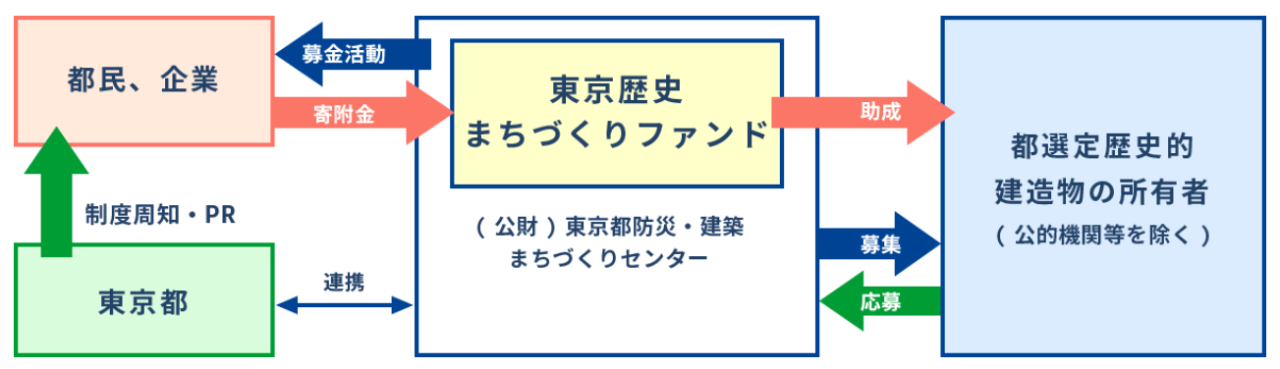 公益財団法人の「まちづくりセンター」は、歴史や文化を感じさせる景観づくりを進める上から歴史的に価値を有する建物の保存や景観上重要な街並みを守る取組みを進めて行くため、都が選定した「歴史的建造物」の適切な保存や利活用を支援していく「東京歴史まちづくりファンド」を運営しております。