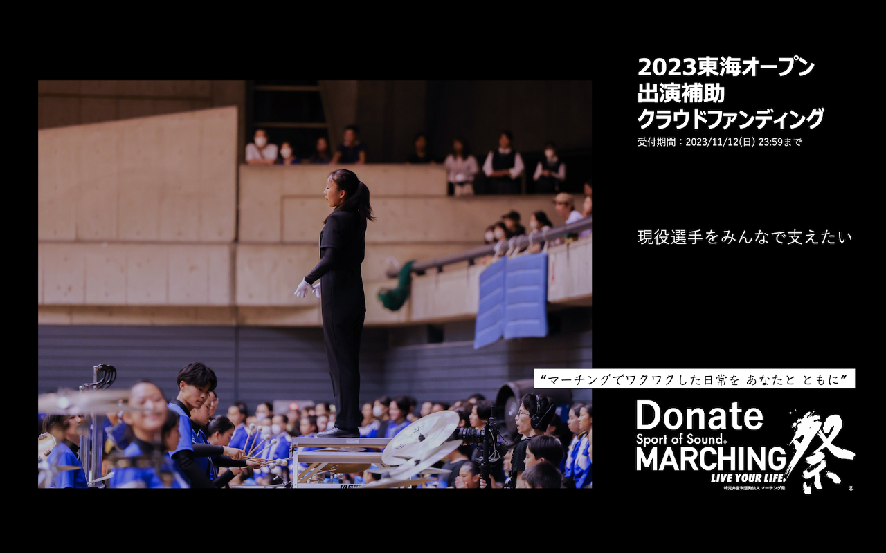 ▶︎2023年11月25日に開催の「東海オープン」出場チームの出演経費補助を出したい! ▶︎理由1:マーチングチームは本番に出演するために当日のバスや楽器運搬トラック手配、当日に必要な物資など多くの費用が掛かります。これら費用の一部を支援し、現役選手たちの費用負担を軽減したい。 ▶︎理由2:現役世代のマーチング活動を応援したり、サポートしたりする文化や活動を共に創りたい。 ▶︎理由3:クラファンを通して、マーチングを楽しむ方法や関わる多様な方法があることを、より多くの方々と共有したい。 ▶︎リターン:ご支援いただいた皆様を、①支援者コミニティーへのご招待、②HP掲載(ペンネーム/イニシャル)を、させていただきます。 ▶︎本支援対象:東海OP出演マーチングバンド ▶︎ご支援イメージ:"1,000円のご支援が500名集まる" 小さい、永く、継続できるようなご支援文化を築いていきたいです。