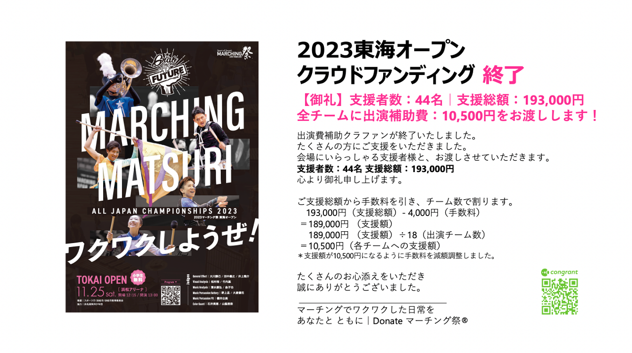 ▶︎2023年11月25日に開催の「東海オープン」出場チームの出演経費補助を出したい! ▶︎理由1:マーチングチームは本番に出演するために当日のバスや楽器運搬トラック手配、当日に必要な物資など多くの費用が掛かります。これら費用の一部を支援し、現役選手たちの費用負担を軽減したい。 ▶︎理由2:現役世代のマーチング活動を応援したり、サポートしたりする文化や活動を共に創りたい。 ▶︎理由3:クラファンを通して、マーチングを楽しむ方法や関わる多様な方法があることを、より多くの方々と共有したい。 ▶︎リターン:ご支援いただいた皆様を、①支援者コミニティーへのご招待、②HP掲載(ペンネーム/イニシャル)を、させていただきます。 ▶︎本支援対象:東海OP出演マーチングバンド ▶︎ご支援イメージ:"1,000円のご支援が500名集まる" 小さい、永く、継続できるようなご支援文化を築いていきたいです。