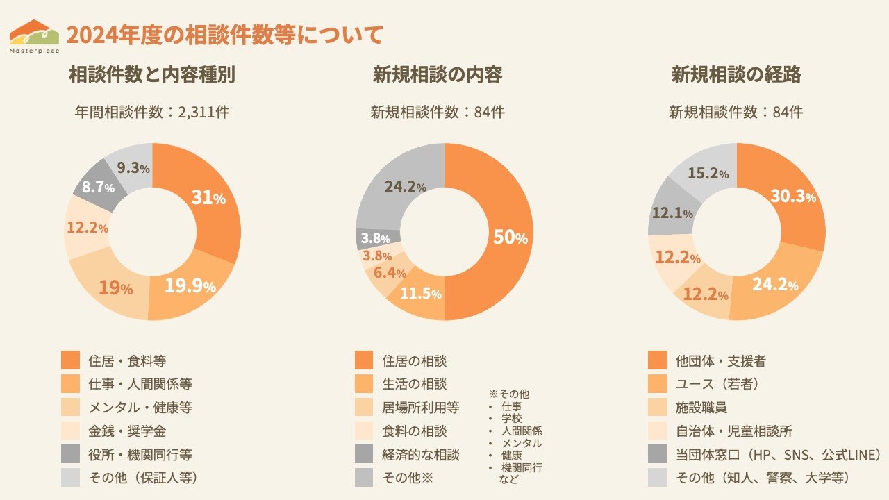 また、マスターピースは児童養護施設などを経験していない、いわゆる虐待サバイバーと言われる方々の相談も受けていますが、そういった背景の若者は、現在親元で被害を受けていて経済的搾取も受けていて1人立ちが困難であるケースが多くあります。