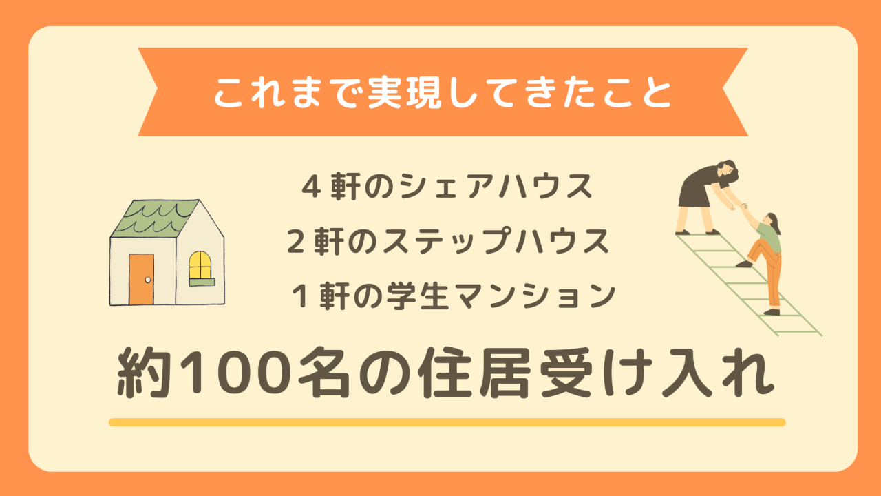 これまで約10年の活動を経て、マスターピースはシェアハウス4軒、ステップハウス2軒、学生マンション1軒で住居事業として約100名の親を頼りづらい若者を受け入れてきました。