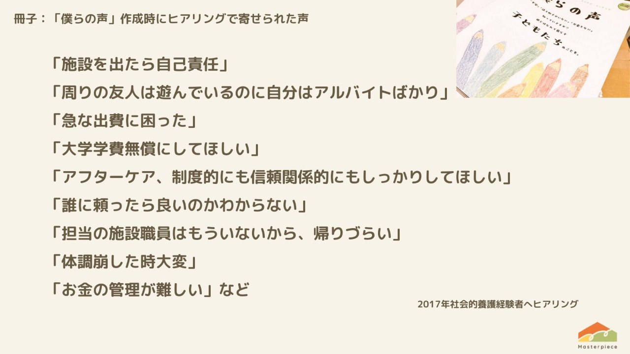 児童養護施設を巣立った若者のおよそ80%が高卒で働いています。進学を望みながらも金銭的な状況で諦める若者たちが多くいます。奨学金は増えましたが、相当な志やモチベーションがないと奨学金が通らない。一般家庭で育った多くの若者がしているような「ナントナク進学」は、私たちには許されない。施設出身だから仕方ない、我慢、自己責任、誰かのすねをかじることもできないので自分で何とかしていくしかない。そのように、若者は生活のことから学校、仕事のことなどを自分でこなしていくのです。