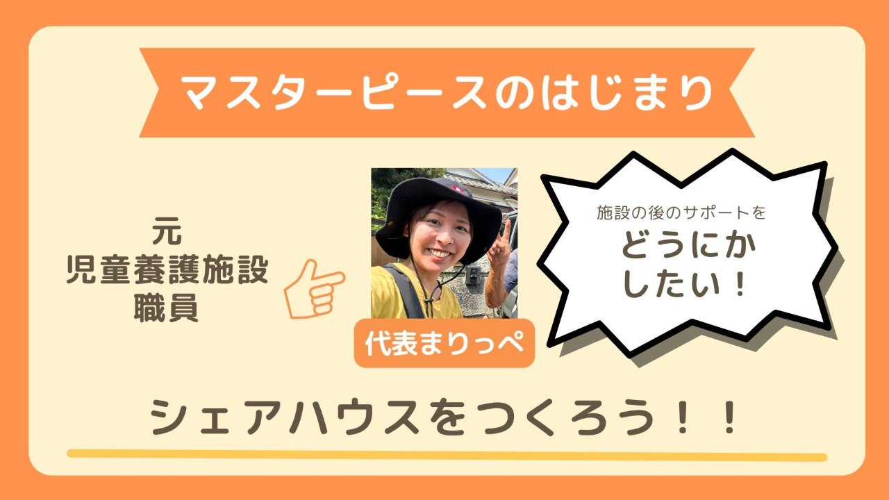 代表まりっぺは児童養護施設の職員でした。施設で働く中で、公的支援を離れた後の若者たちがさまざまな壁にぶつかっていくのを見てきました。突然の離職、学校の退学、仕事とともに住まいを失うこと、予期せぬ妊娠、メンタル不調…。家族のように寝食を共にした子どもたちが、そういった困難にぶつかっていく姿を見て、いてもたってもいられずに10年前にシェアハウスを始めたところからマスターピースは始まっていきました!