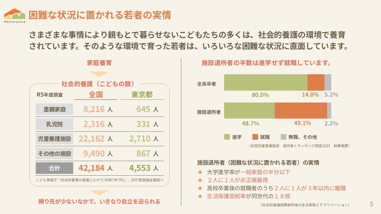 そこから保護された子どもたちは児童養護施設や里親家庭等で過ごすことになります。その数42000人。日本では80%が児童養護施設で暮らしています。そして、子どもたちの多くはおよそ18歳で一人立ちをしなくてはなりません。自己肯定感が低いまま、自分の人生や将来に希望を持てないまま、大人や社会を信頼できないまま社会に巣立つ若者もいます。そして、そういった目に見えない生きづらさと戦いながら、若者たちは社会の荒波に立ち向かっていくのです。