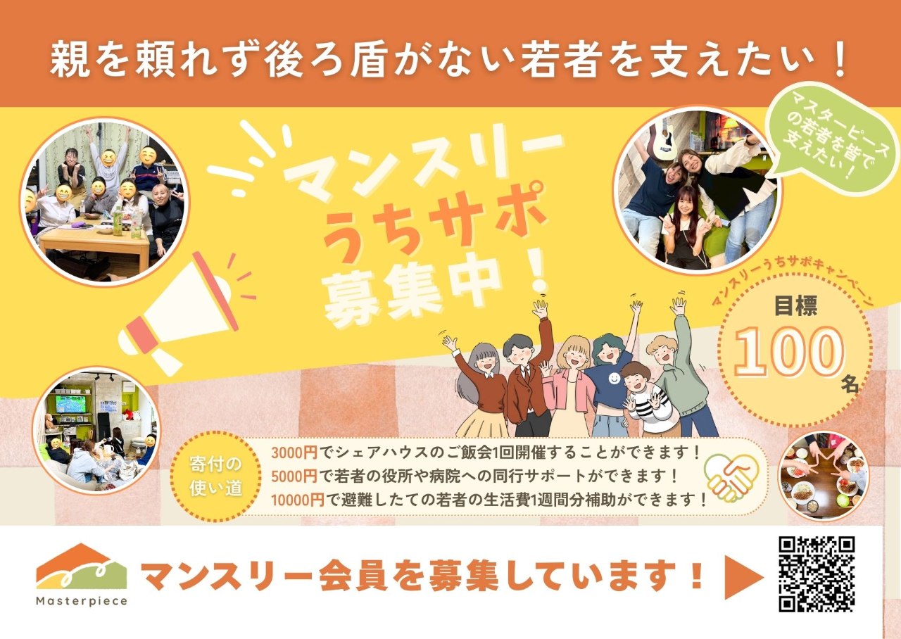 マスターピースには、毎月継続してご支援くださるマンスリーサポーターが必要です!様々な助成金などは使途が限られており、緊急的な支援を行うことがなかなか難しい状況にあります。早めに食料がほしい、お金がないけど親元から逃げて来たいという緊急を要する相談もしばしばあります。そういった時に、マンスリーサポートの力によって私たちも安心な気持ちで一歩を踏み出すことができます。
