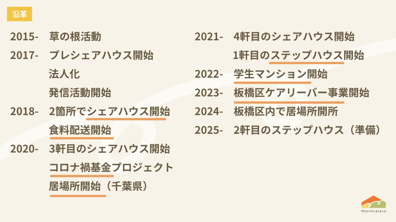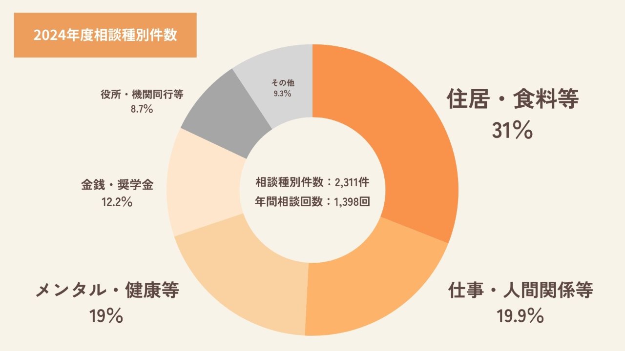 シェアハウスなどの住居があることから、マスターピースには住居の相談が多くあります。危機的な状況から逃れて来て所持金がない状態で来る若者もいます。