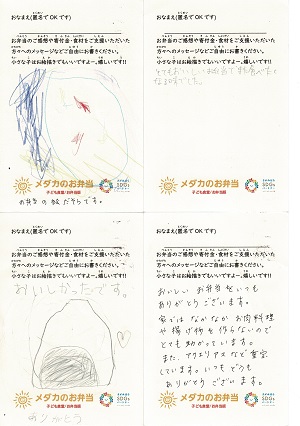 お弁当をご提供させていただいたご家庭や子ども達からの温かいメッセージも続々と届いております。
