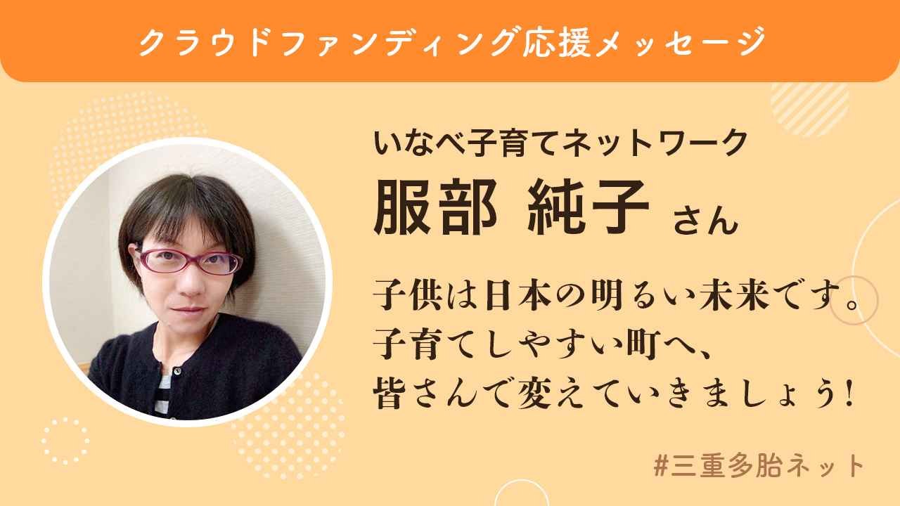 いなべ子育てネットワークの服部純子と申します。私自身、3人の子育てをしています。多胎家庭ではありませんが、1人でも大変な子育てです。
