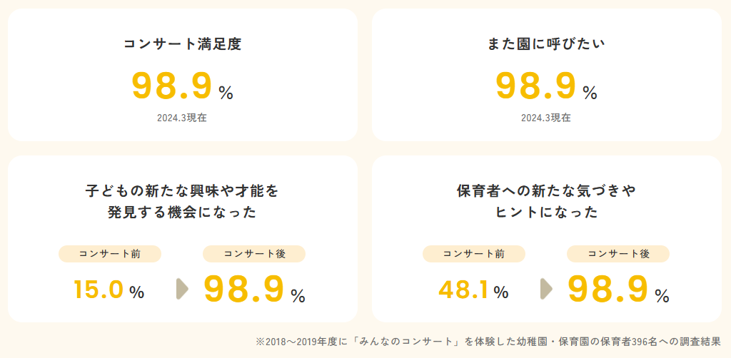 独自のプログラムやノウハウと「子どもに音楽を届けるプロフェッショナル」の活躍により、各園から高い評価を受けています。