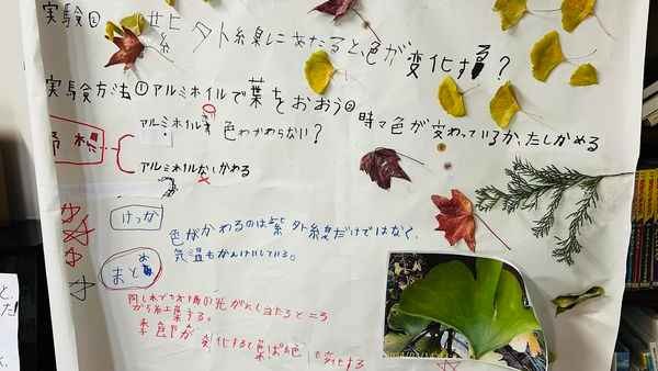 先月は「葉っぱはなぜ赤くなるのか?」というテーマでしたが。小学生もいろんな実験にチャレンジ!していました。
