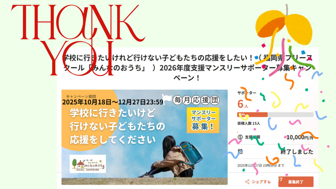 フリースクールは、そんな子どもたちが安心して過ごし、自分のペースで学び、人とのつながりを取り戻せる大切な学びの場です。私たち「みんなのおうち」は今年の6月で、活動10年を迎えました。たくさんの笑顔に出会えた感謝や喜びに溢れる10年でしたが、これまで取り組んできたなかには、支援を届けたくても、利用料という壁を越えられなかったご家庭もありました。今回のキャンペーンでは、2026年4月~1年間の応援をしてくださる方を募ります。