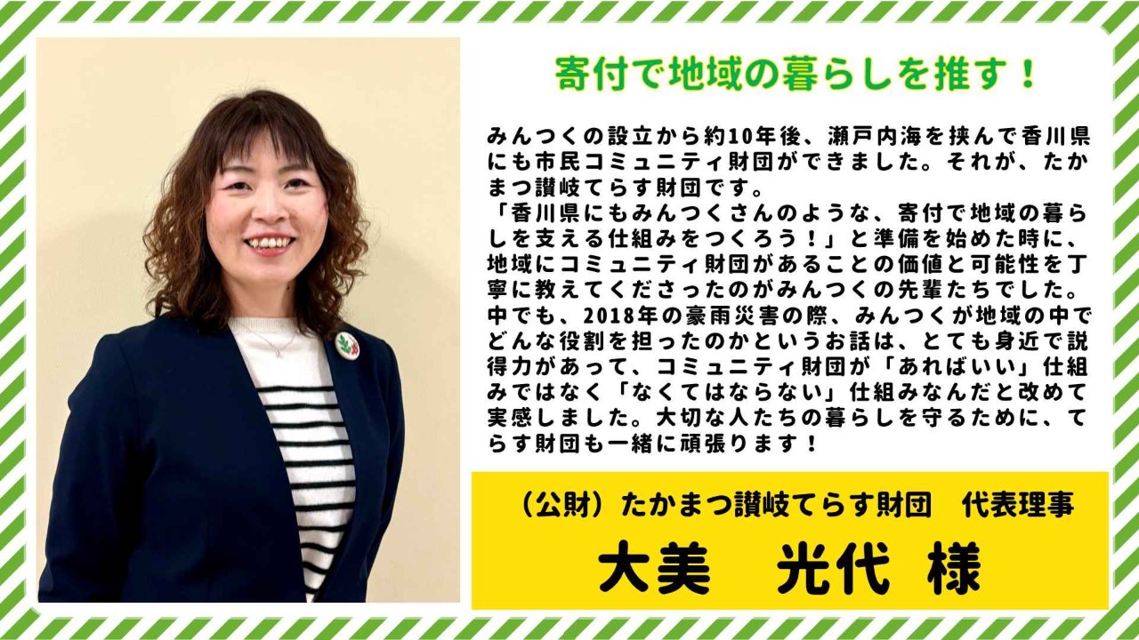 香川県のコミュニティ財団、(公財)たかまつ讃岐てらす財団 代表理事の大美光代さんから応援メッセージをいただきました!