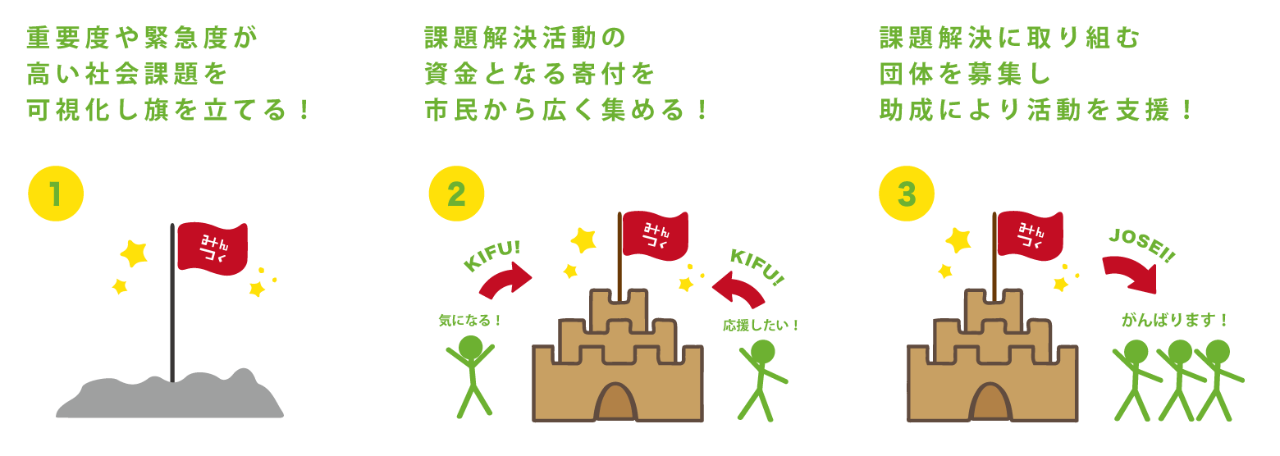 地域の中で重要度や緊急度が高い社会課題を可視化し集まった寄付をもとに課題に取り組む団体へ助成を行うことで、チャレンジを促し課題解決を行う仕組みです。
