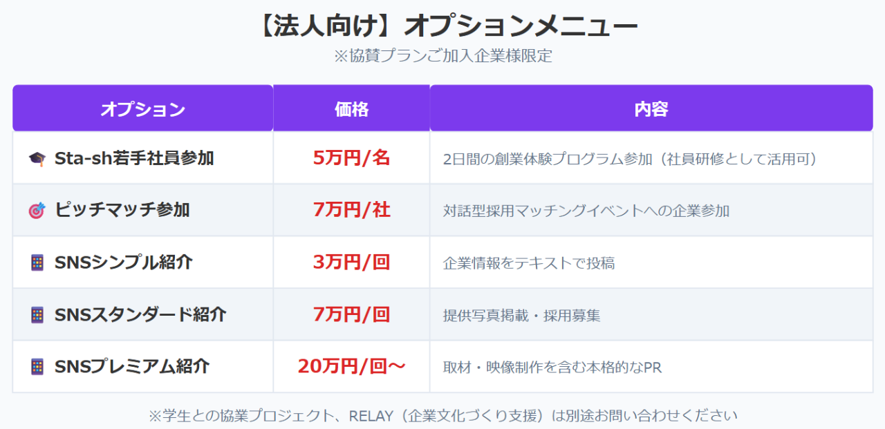 地域の若者育成を応援していただける企業様向けのプランです。 協賛額に応じて、採用時の特別割引が適用されます。