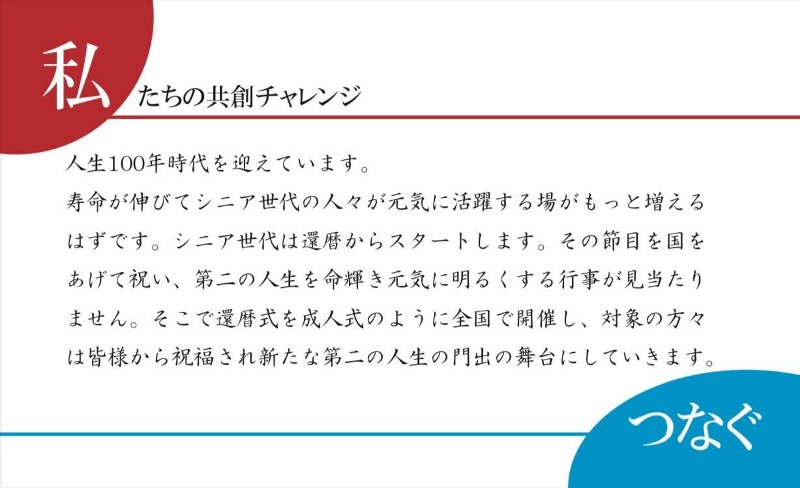 そこで還暦式を成人式のように全国で開催し、対象の方々は皆様から祝福された新たな第二の人生の門出の舞台になればと思います。
