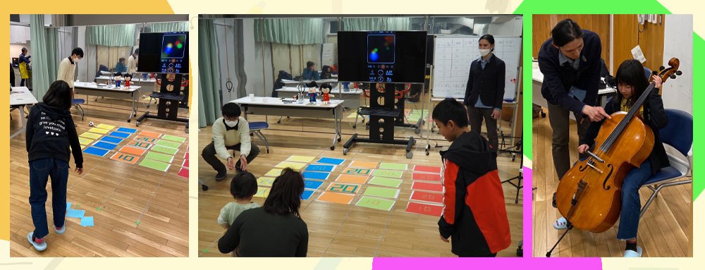 この日、ボードゲーマーの神野優輔さん、チェロのこみてつこと小宮哲朗さんがアート体験の講 師を初めて担当し、技術とアイディアに満ち溢れたゲームで参加者を盛り上げてくれました。