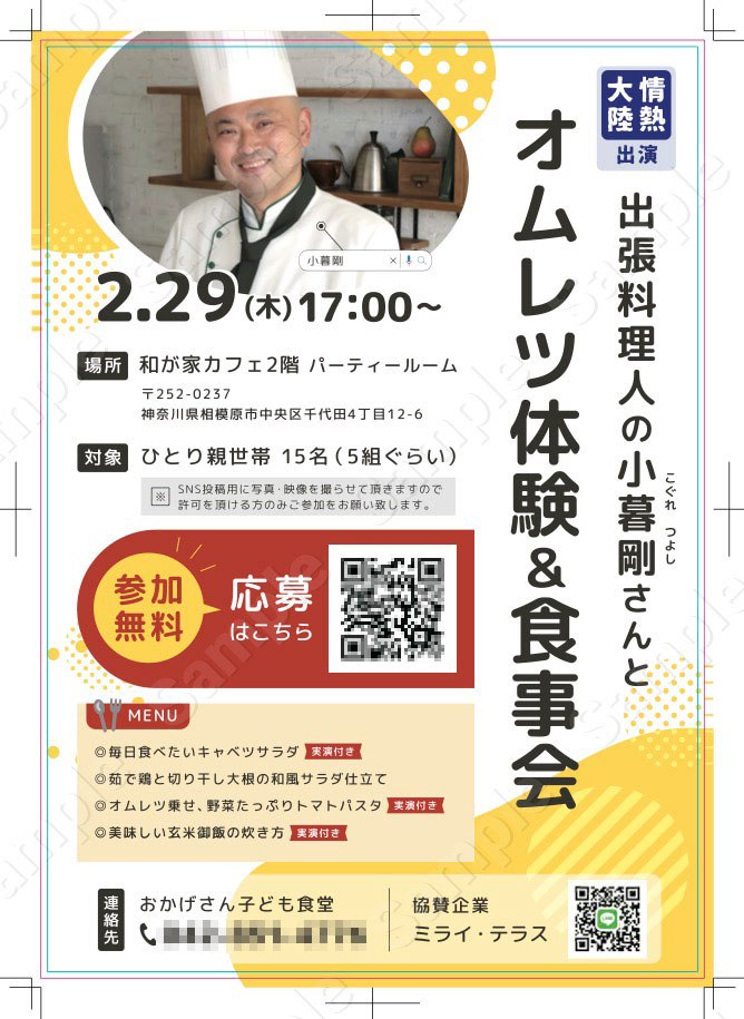 情熱大陸にも出演した出張料理人の小暮剛さんにお料理を作ってもらい、保護者のねぎらい、子どものオムレツ体験をしたいと企画しています。」