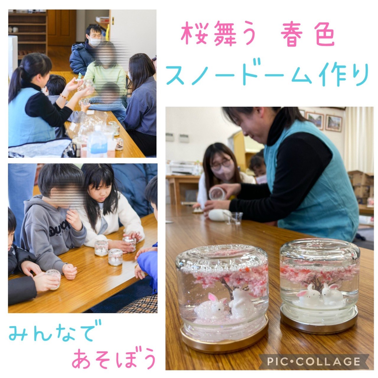 みんなであそぼうは、布小物作家さんが桜色のラメをキラキラ光る春色スノードームの作り方を教えてくれましたよ。