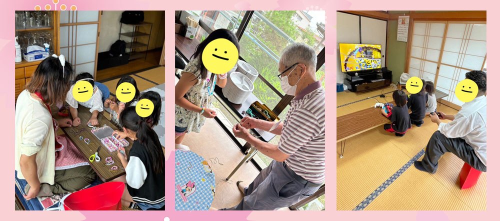 一緒に食事を楽しそうにとったり、おもちゃやカードゲーム、テレビゲームで遊ぶ子どもと大人たち。