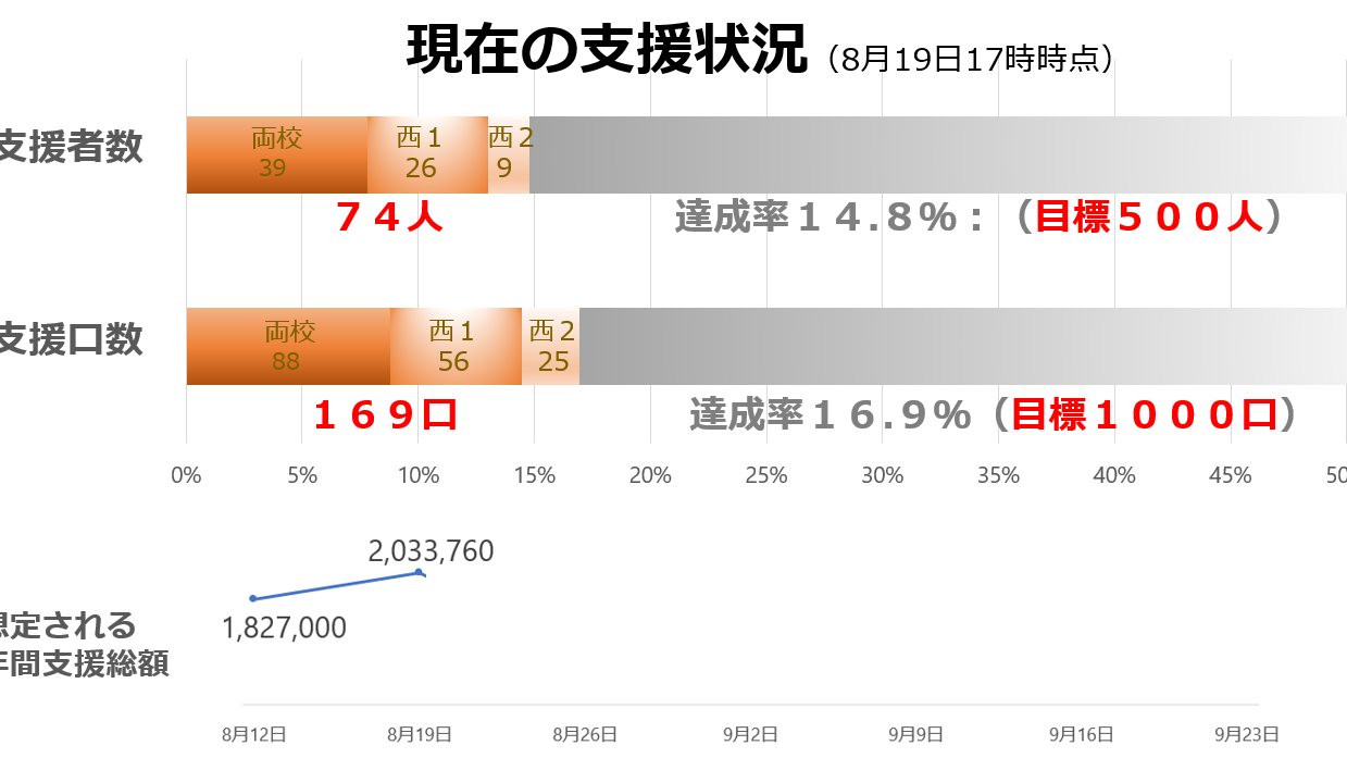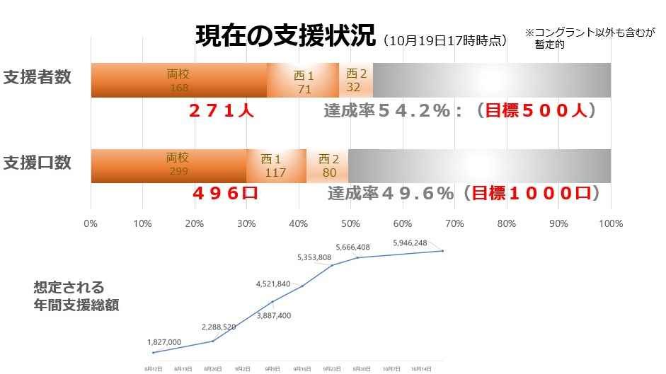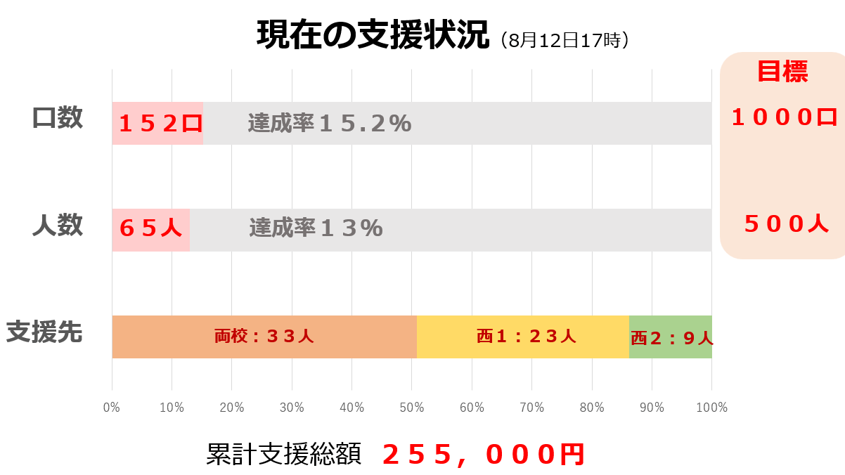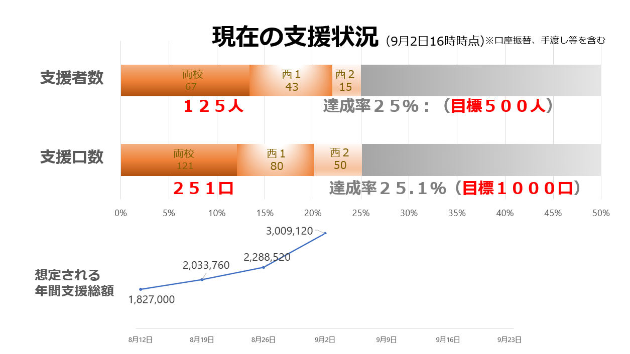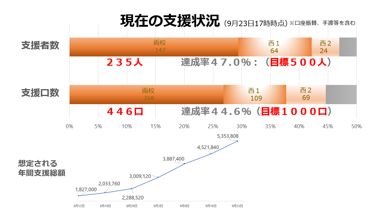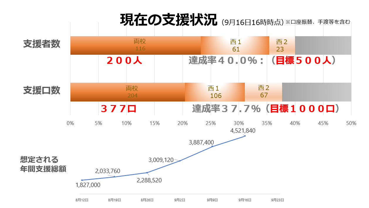 2024-09-11 17:07<たまサポの進捗状況>(9/9現在)現在の支援状況(9月11日) 〇サポーター数:176人 ・両校:98人、西1:58人、西2:20人 ・進捗率35.2%(目標500人) 〇支援口数(1口1千円):324口 ・両校:163口、西1:103口、西2:58口 ・進捗率32.4%(目標1,000口) ぜひこのプロジェクトをお知り合いの方にも拡散してください。 応援よろしくお願いします!2024-09-11 17:07<たまサポの進捗状況>(9/9現在)現在の支援状況(9月11日) 〇サポーター数:176人 ・両校:98人、西1:58人、西2:20人 ・進捗率35.2%(目標500人) 〇支援口数(1口1千円):324口 ・両校:163口、西1:103口、西2:58口 ・進捗率32.4%(目標1,000口) ぜひこのプロジェクトをお知り合いの方にも拡散してください。 応援よろしくお願いします!