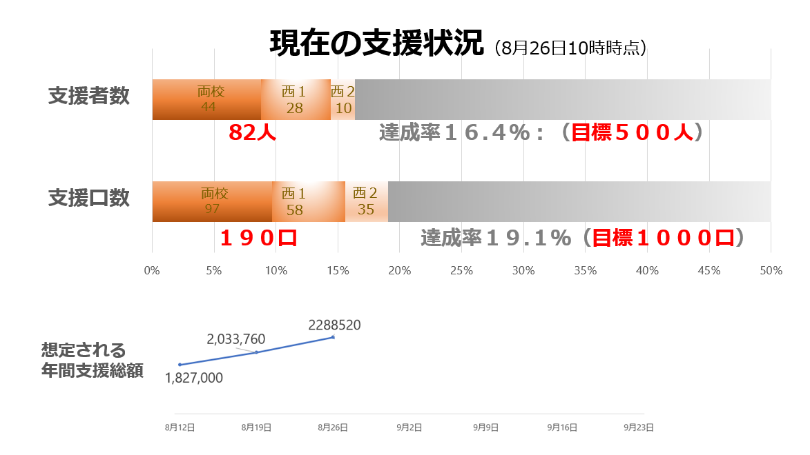 現在の支援状況(8月26日) ・サポーター数:82人(進捗率16.4%) ・支援金月額:197,530円(進捗率19.1%) ・支援金累計:441,110円 目標達成まであと418人、月額803,000円です! ぜひこのプロジェクトをお知り合いの方にも拡散してください。 応援よろしくお願いします!