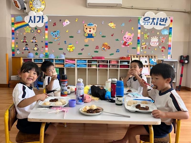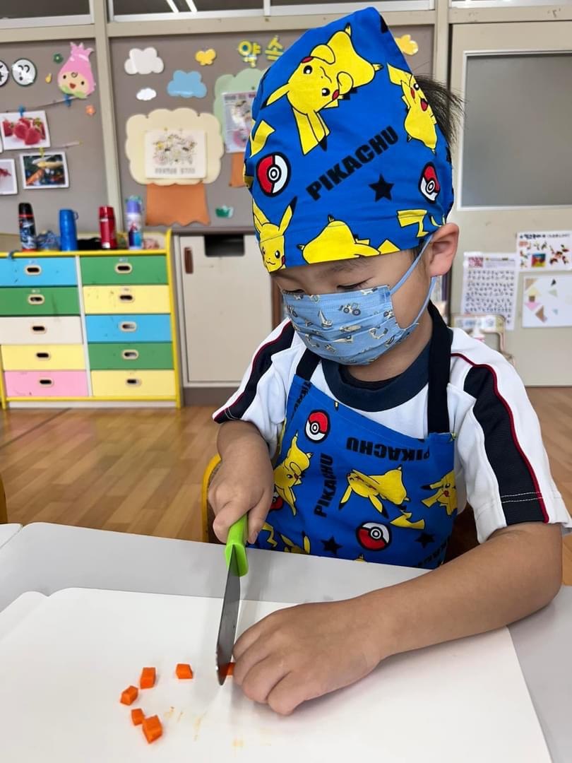*活動報告には滋賀朝鮮初級学校より、ミレ教育財団へ送られた記事を載せてます。 大事な食育の一環として行っているお料理会☺ 今回はにんじんとピーマンのハンバーグ🥕🫑、ポテトサラダ🥔、フルーチェ🍑を作りました。 野菜を見て一瞬固まった園児たちでしたが… 年長、年中組は野菜のみじん切りに挑戦し、年少組はポテトサラダを作りました! みんな苦手な野菜もしっかり食べて、お腹いっぱいになりました😋