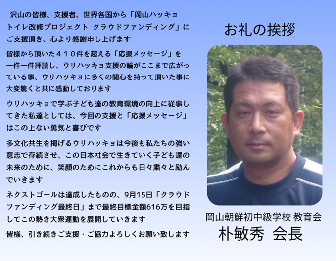 岡山朝鮮初中級学校 教育会 朴敏秀会長からのお礼のメッセージをご一読ください。
