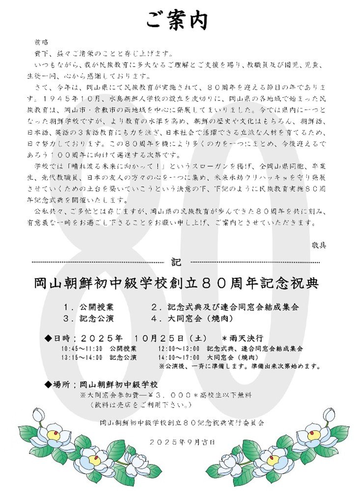오카야마현 구라시키시 미즈시마에 오카야마조선초중급학교가 있습니다.
