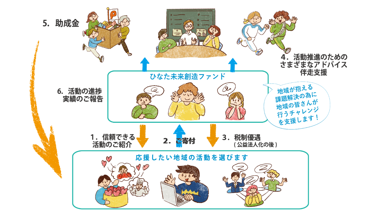 「一般財団法人 ひなた未来創造ファンド」では、地域に暮らす人たちが、相互に助け合い、地域で抱える課題の解決策を実践する団体や個人(個人の場合は規約を作成し実行委員会を設立すること)を資金面とノウハウの提供を通じて支援し、応援していきます。