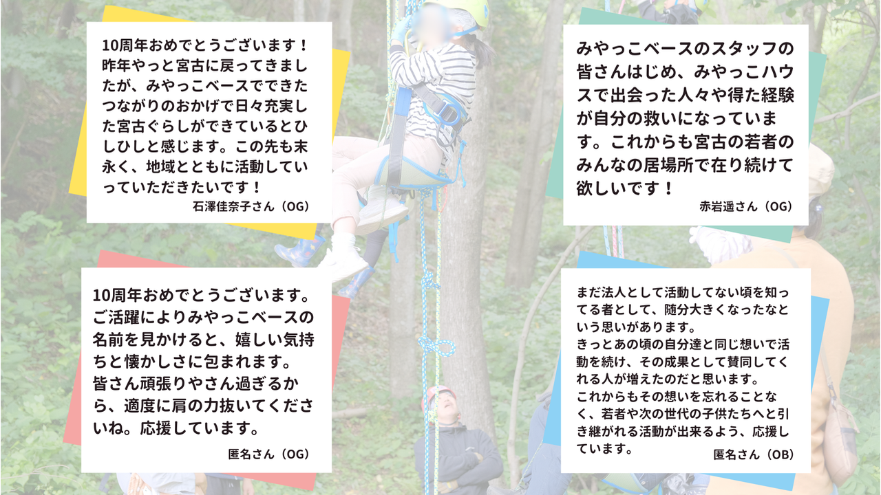 日頃よりみやっこベースを応援いただき、誠にありがとうございます。応援メッセージ紹介 第5弾をお届けします! 今回は高校時代にみやっこベースで活動をしていたり、みやっこハウスを利用していたOBOGからのメッセージをご紹介します。 今後とも皆様の温かいご支援、ご声援をどうぞよろしくお願いいたします。