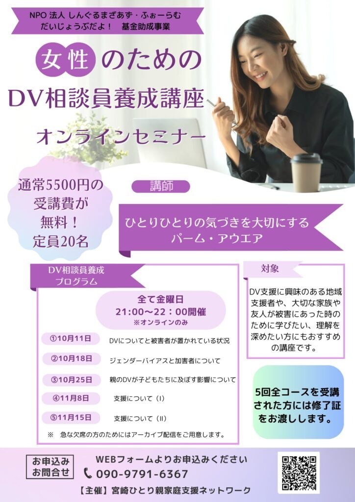 ひとり親の中には、DV被害に遭われた方もいらっしゃいます。私たちはDV被害に合われた方達の相談対応ができるよう、養成講座なども行っています。