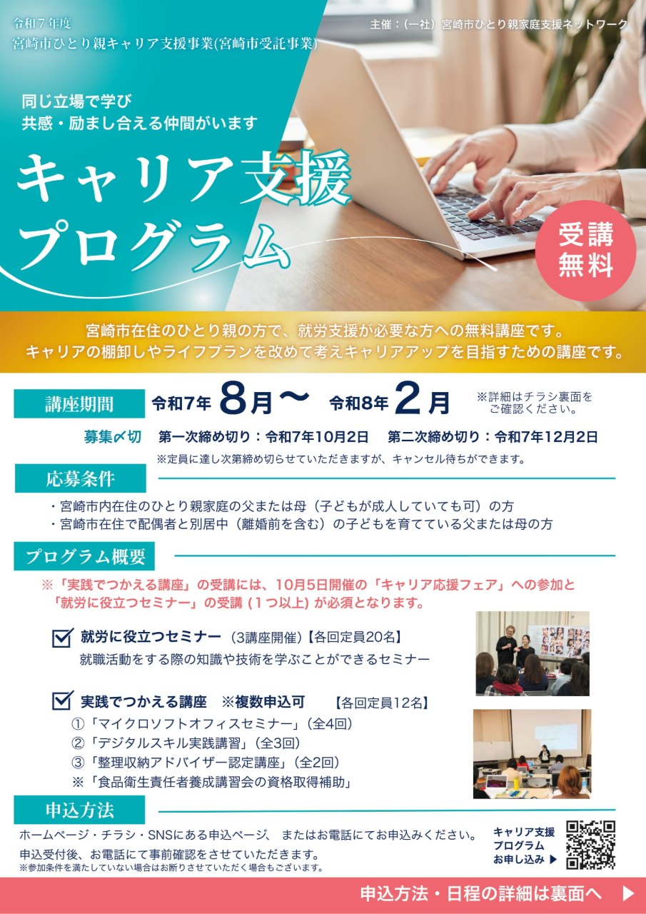 私たちは、宮崎市の委託を受けて令和5年度よりキャリア支援事業を行っています。就労だけでなく、様々な困りごとに対する相談も多く、よりひとり親に対する支援の必要を感じているところです。実際に就職されたひとり親の方もいらっしゃり、現在は就職後も継続的なサポートを受けられる支援体制を構築中です。