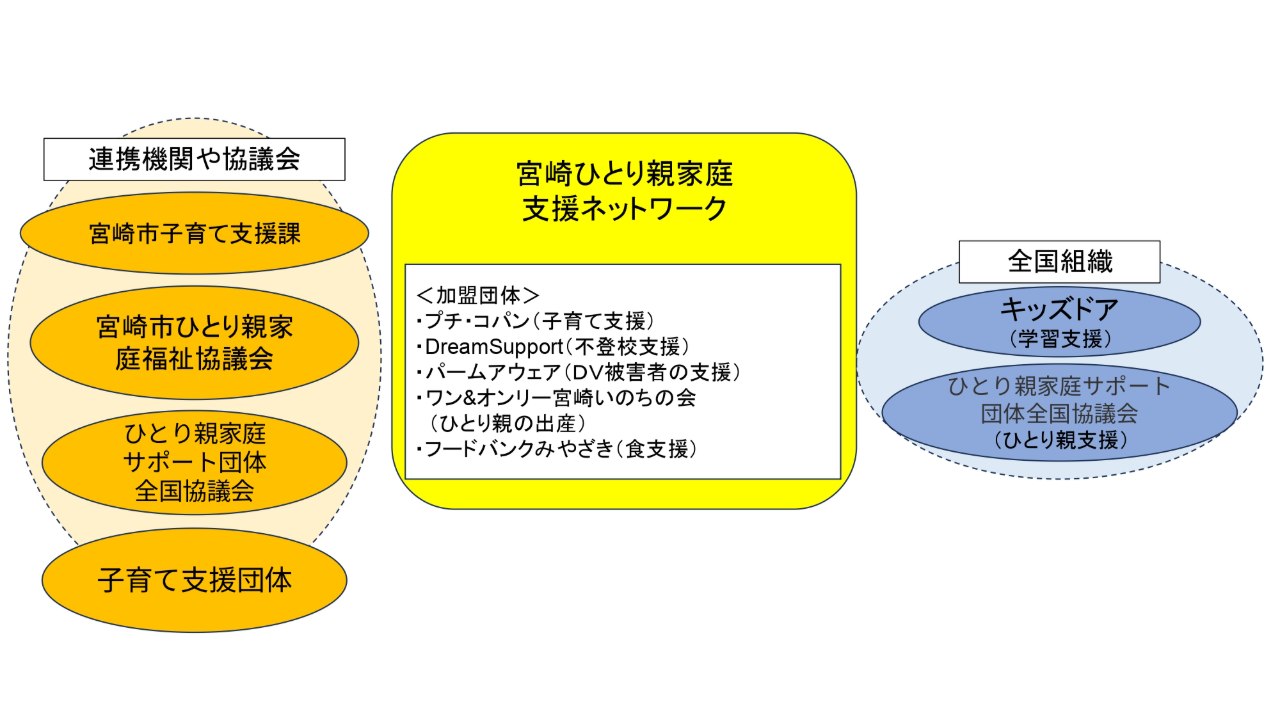 各地域で活動する中での情報共有、提供はもちろんのこと、シングルマザーサポート団体全国協議会に加盟し、月一回の定例会等で様々な情報を収集、宮崎県でできる事を協議して、ひとり親家庭の人が時間的にも金銭的にも社会的にも心に余裕を持ち安心して暮らせるように支えサポートし、必要な関係機関へお繋ぎします。