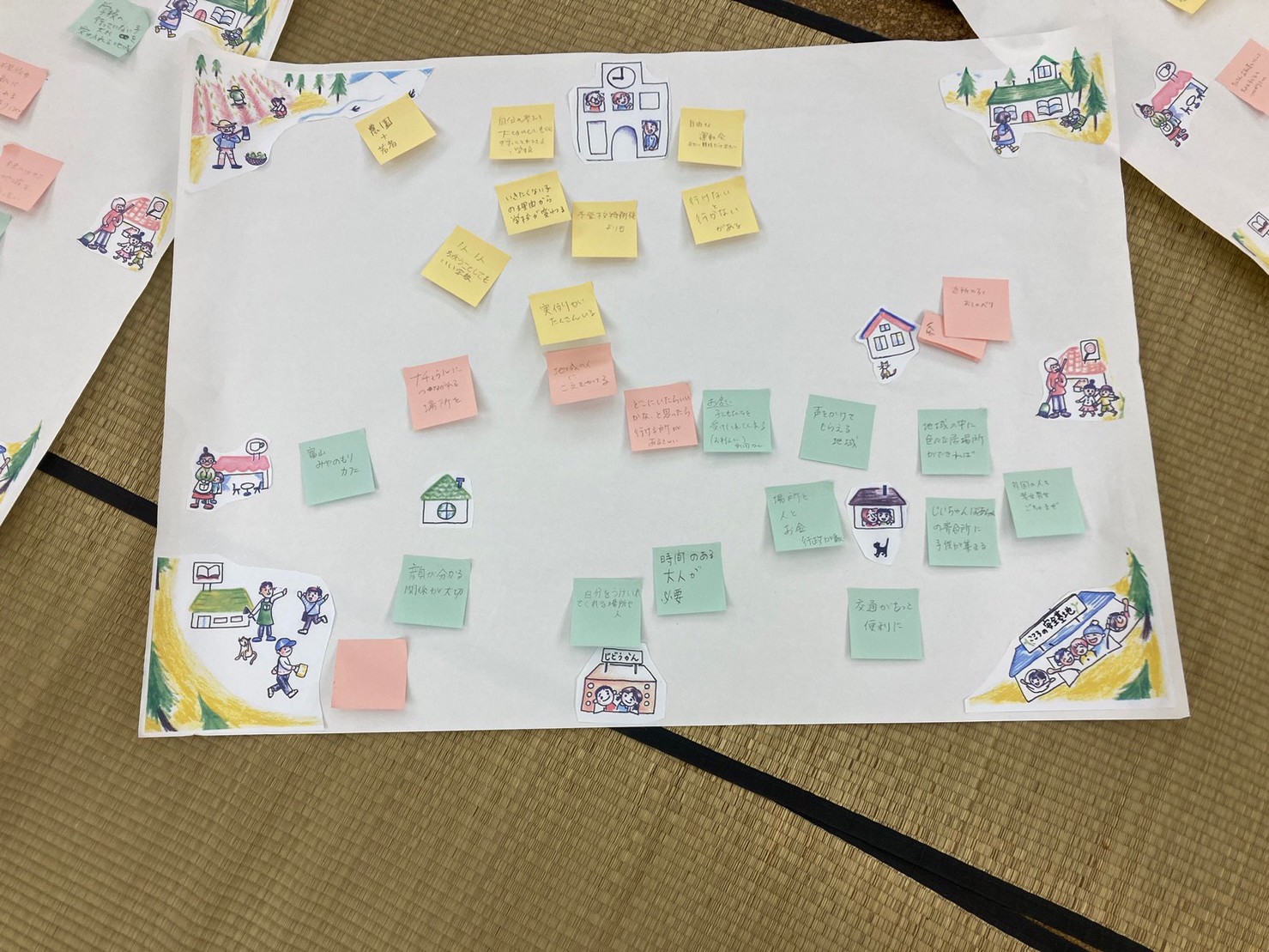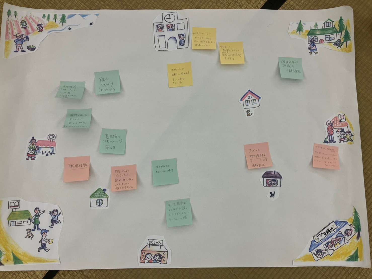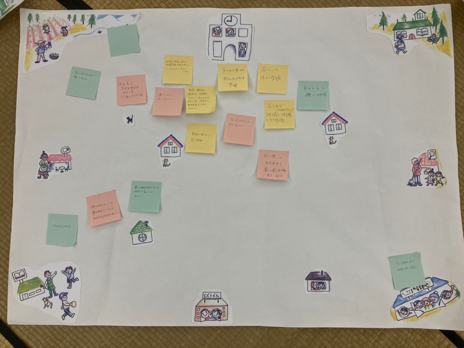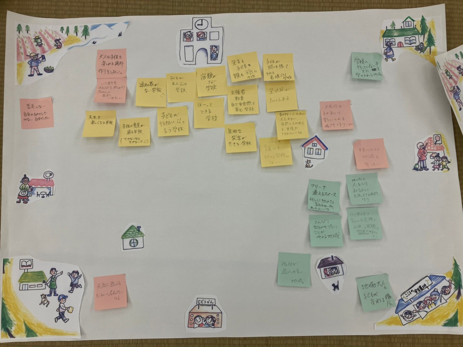 ↓皆さんが描いてくれた「夢みる地域」です。それぞれの立場でそれぞれの境遇で「今」私たちができることを考えることができました。