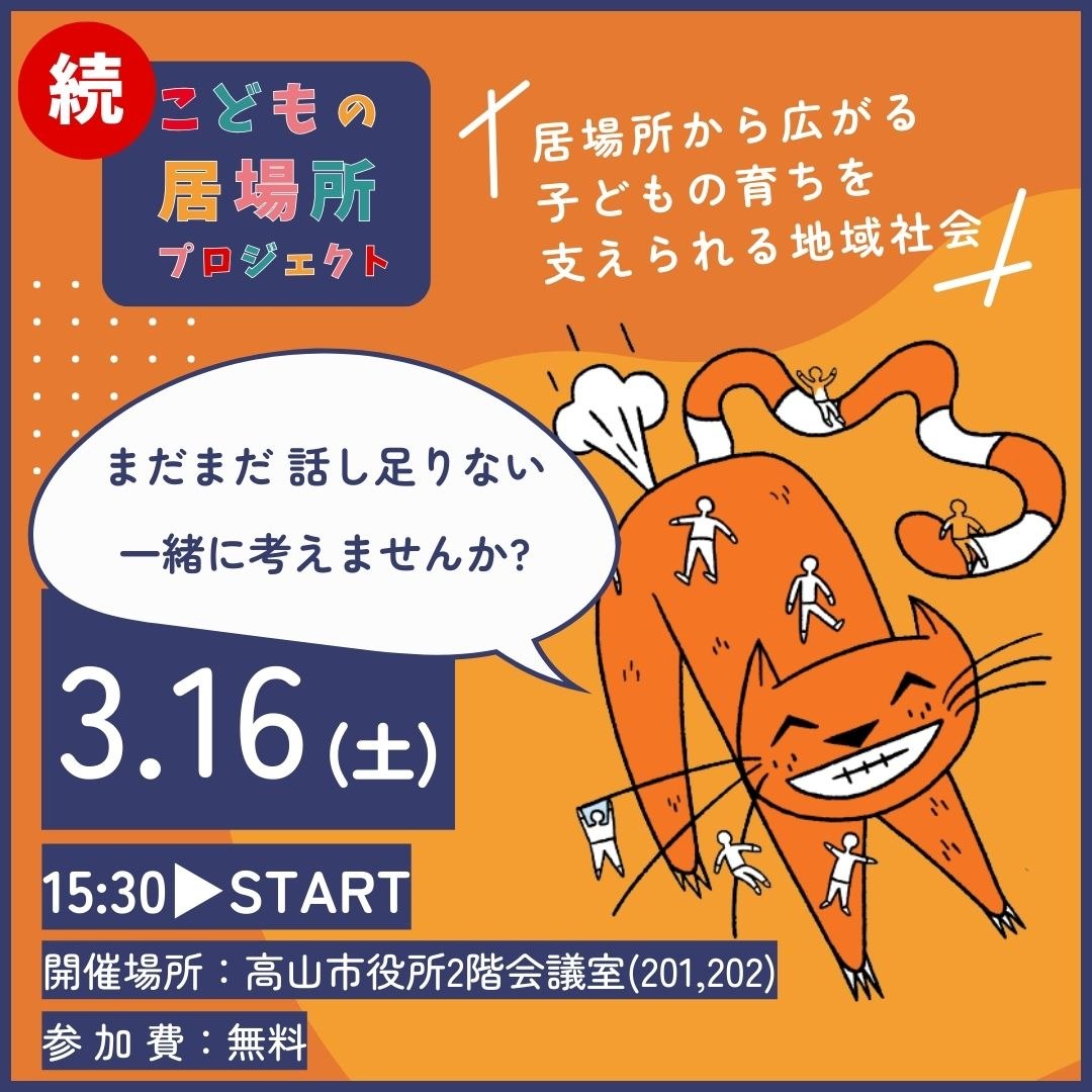 そして、お知らせ「続居場所プロジェクト」を3/16(土)15:30~17:30@高山市役所2階会議室で開催すること決定しました。