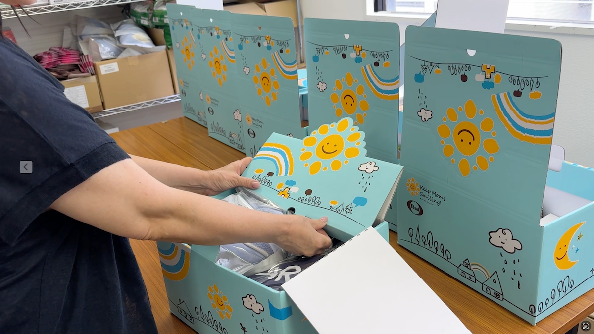 病室にいるご家族が、明るい色やかわいいイラストで少しでも元気になれるようにと、段ボールも工夫がほどこされています。