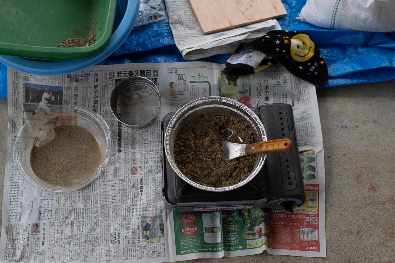 神様の山として崇められていた時代、人々が自然や人間以外の動物に対してむけていたであろう眼差しと、この国が推し進め無視してきた自然への眼差しのあり方との狭間において、過去から現在に至るまで膨大な時間を経て、あまたの生き物の生と死のサイクルの中で積層してできた土に対する態度あり方のようなものを、使用する絵の具を実際に採集した土から作ることから考えることを行いました。