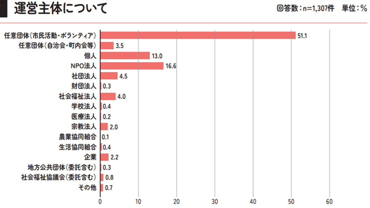 第9回「こども食堂の現状&困りごとアンケート(2024年)」では、運営されている主体についてもお聞きしています。運営主体は、任意団体(市民活動・ボランティア)が最も多く5割を超えていました。次いで、NPO法人や個人での運営が多く、上位の3項目で約8割を占めていました。