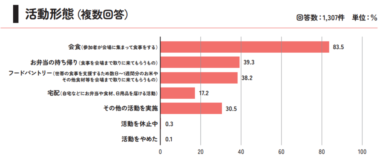 活動の形態も、会食は8割以上のこども食堂で実施していますが、お弁当の持ち帰りを中心に実施されているところや、フードパントリーを開催されているところ、その他の活動と合わせて開催されているところも少なくありません。地域の人々が、それぞれの思いと目的に合わせて、まさに、自発的に多様な形で活動されていることがわかります。私たちは、こども食堂の2025年の「いま」を多くの方々に伝えて、必要な支援や、応援につなげていきたいと思います。