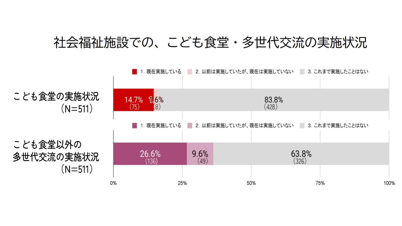 むすびえが、全国社会福祉法人経営者協議会のご協力をいただいて実施した「社会福祉施設におけるこども食堂・多世代交流の取り組み実態調査」(アンケート調査 有効回答数511件、インタビュー調査 8件)では、14.7%の施設で、こども食堂を実施していました。*