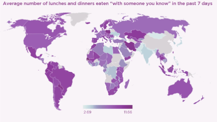 日本の幸福度は55位…という国別ランキングが注目されがちなこのレポートですが、2025年版では誰かと一緒に食事をとることと幸福度や社会的なつながりとの関係や、孤独感などがテーマとして取り上げられていました。