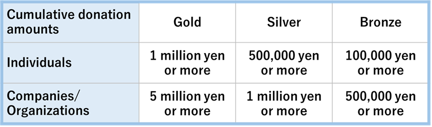 Donors’ names will be displayed on different-colored plaques based on their cumulative donation amounts. Please refer to the table below for the plaque colors. The donor plaque is planned to be installed in the Innovation Commons that we will develop in the future. We would like to engrave your name on it. We kindly ask for your support.