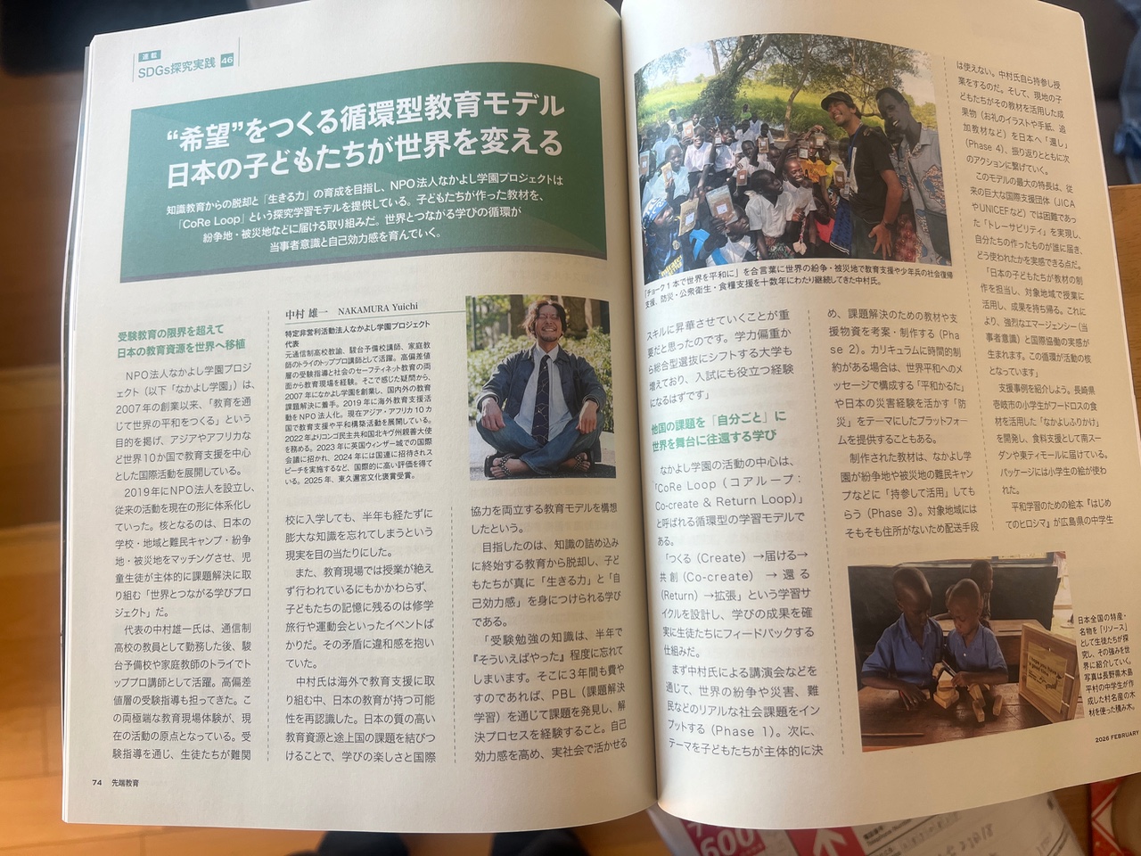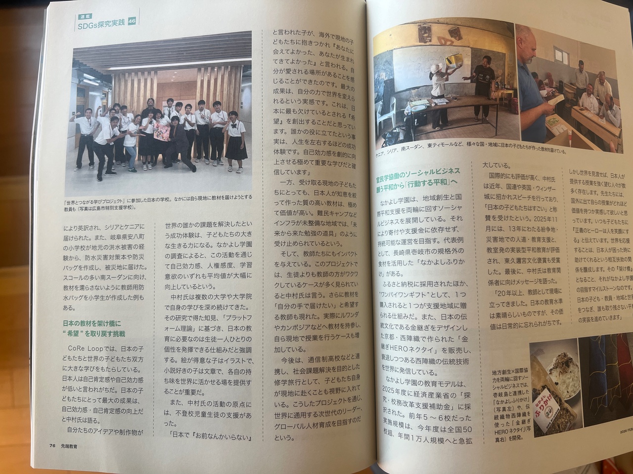 月刊『先端教育』2026年2月号に、なかよし学園の循環型探究学習モデル「CoRe Loop」が掲載されました。教材を“つくる→届ける→共に振り返る→還す”ことで、学びの成果を現地の声とともに日本へ戻し、自己効力感と平和意識を育てる実践が紹介されています。経産省補助金採択を契機に全国50校超へ拡大。会員の皆さまのご支援に感謝します。