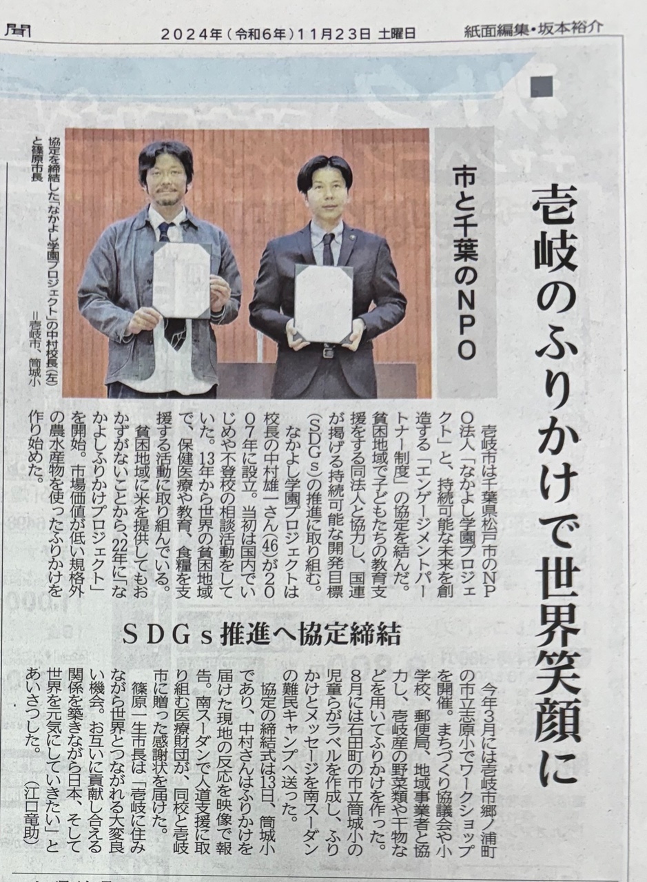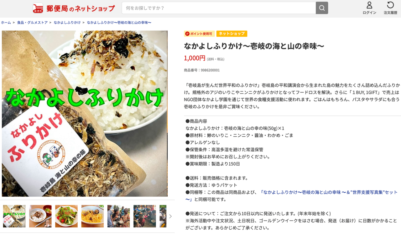 このプログラムでは小学生が考案したふりかけで、壱岐島のフードロス食材に価値を与え、世界各地に美味しいを届けるというモデルを実現しています。また、日本郵便とのコラボレーションで郵便局ネットで販売も行っています。ふりかけの売上でなかよし学園の活動国での食糧支援活動を行うという産官学民連携モデルによる活動は、国際連合やWindsor城で発表されるなど、世界中で注目されています。