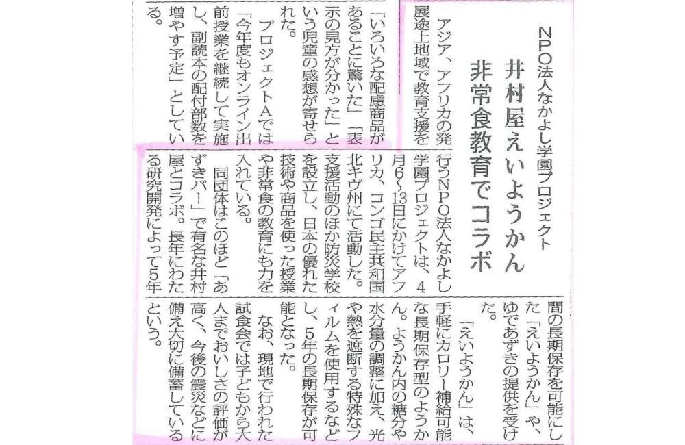 私たちなかよし学園は、コンゴ民主共和国での火山災害や紛争被害下の難民キャンプにおいて、井村屋「えいようかん」を非常食として配布し、生命を守る支えとなる食の支援を実施してきました。本取り組みは2022年5月11日付『食品新聞』で紹介され、現場のニーズに即応する防災食としての価値が広く伝えられました。