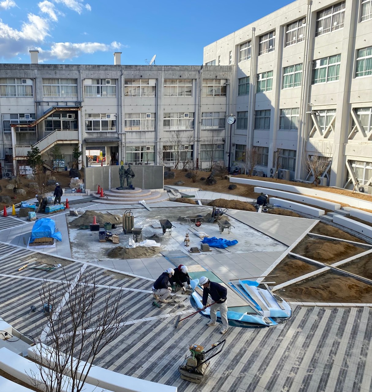 - プラトンとアリストテレス像の移設も無事完了し、現在は樹木の移植、タイル舗装工事が行われています。来週にはアーチが搬入される予定。
