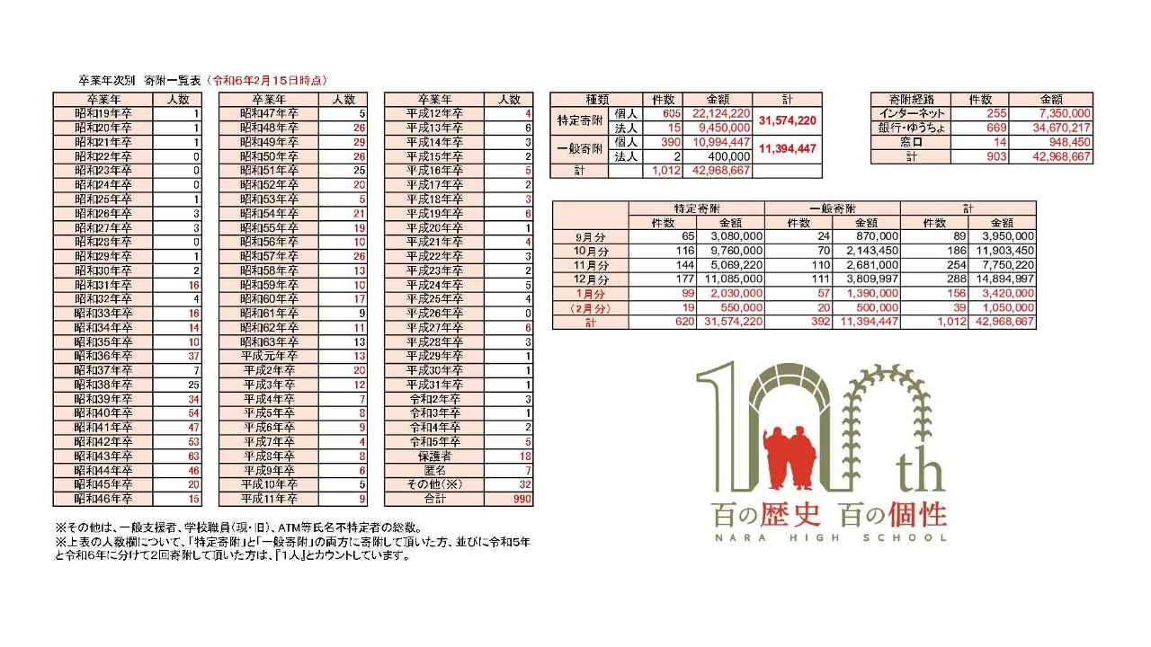 奈良高校創立100周年記念事業実行委員会から、記念事業並びに記念募金について卒業生の皆さまへお知らせいただきたいとのお願いがありましたので連絡します。