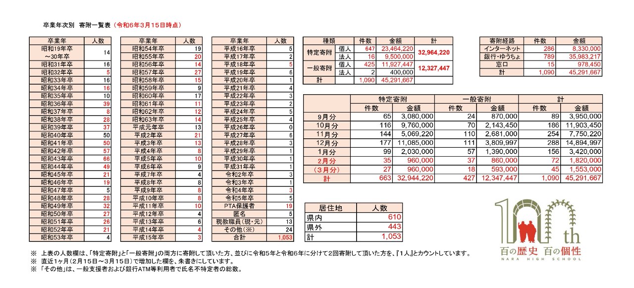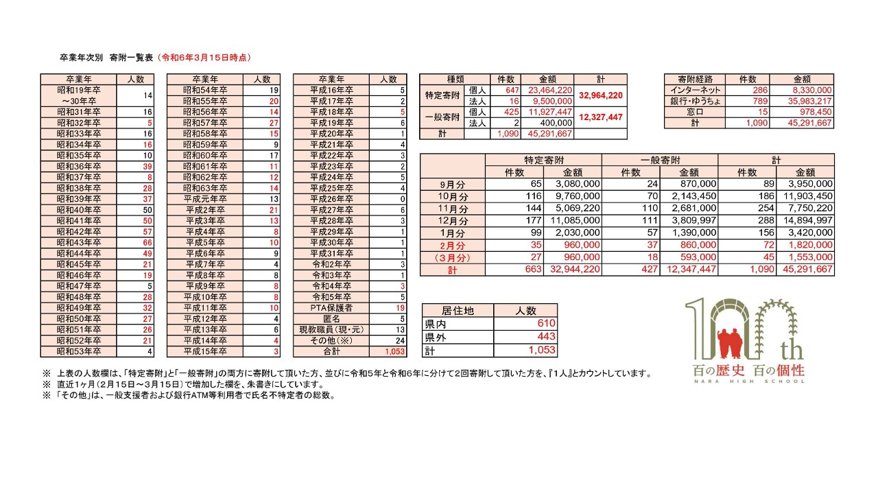 奈良高校創立100周年記念事業実行委員会から、記念事業並びに記念募金について卒業生の皆さまへお知らせいただきたいとのお願いがありましたので連絡します。